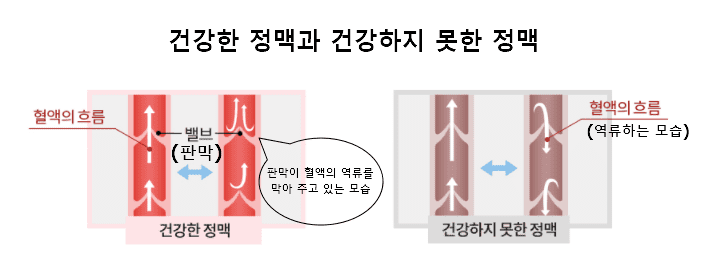 판막이 제기능을 못하게 되니 혈액이 심장으로 보내지지 못하고 다리 쪽으로 흘러내려 고이게 되고요.