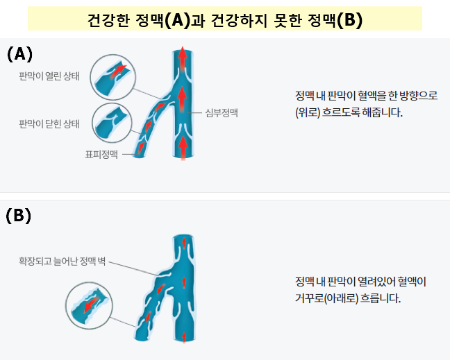 건강한 정맥의 경우에는 판막이라는 게 있어 피가 올라가면 다시 내려오지 않도록 일시적으로 막아주어 올려 보내는데 문제가 없지만,
