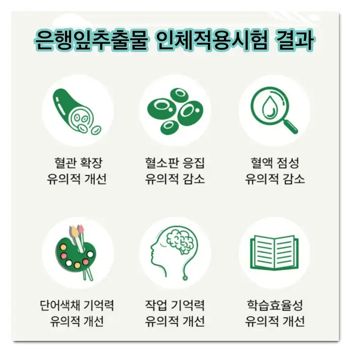 은행나무잎의 인체적용시험 결과, 혈관 확장 기능, 혈소판 응집 억제, 혈액 점성 감소 등의 혈행개선 효과가 있었고요. 단어 색채 기억력 유의미한 개선, 작업기억력 유의적 개선, 학습효율성 유의적 개선 등의 기억력 개선 효과가 보고되고 있습니다.