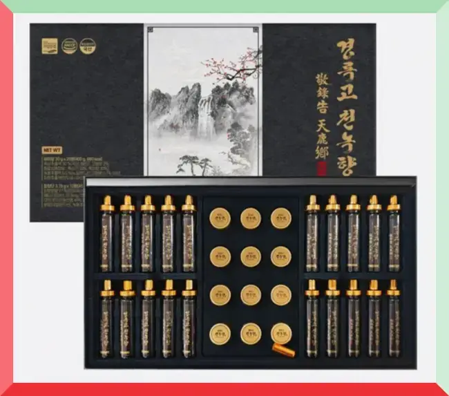 경옥고천녹향은 사실 잘못된 이름이고 원래는 '경록고 천녹향'인데요. 이 제품은 사향부터 시작해서, 녹용, 흑삼, 침향, 그리고 당귀, 작약 등 온갖 약재들이 다 들어 있는 보약중의 보약이라고 할수 있는 제품입니다.