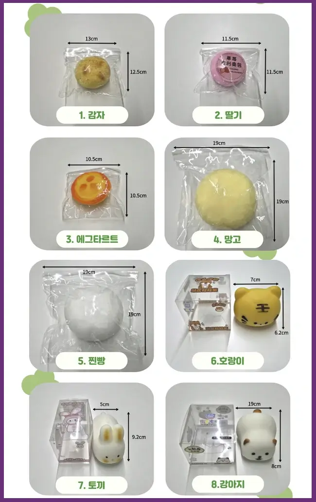안다미로 말랑이는 모양에 따라 다양하게 구분되고, 또 이름붙여지는데요. 모양은 찐빵, 감자, 딸기, 에그타르트, 망고, 호랑이, 토끼 등 다양하더라고요.