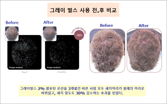 블랙턴 회사에서 자체적으로 한 임상시험이 있는데요. GREYVERS란 성분이 노화모발의 원인인 멜라닌 색소 감소와 모발 산화 스트레스 증가를 억제하여 본연의 모발 색상으로 돌아가도록 한다는 임상 결과를 얻었다고 합니다.