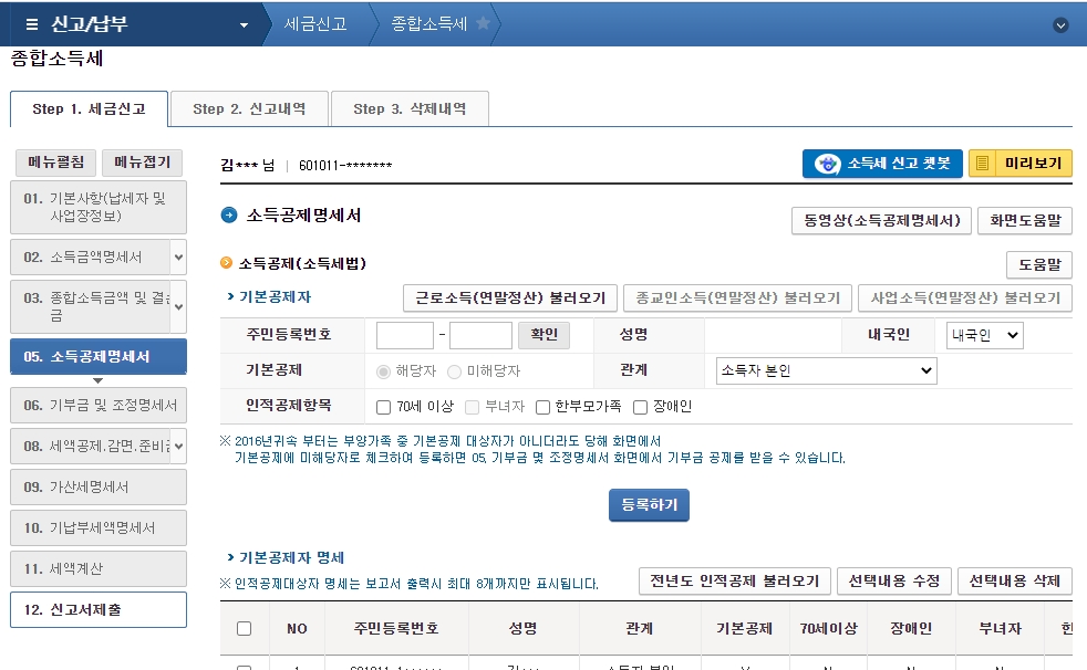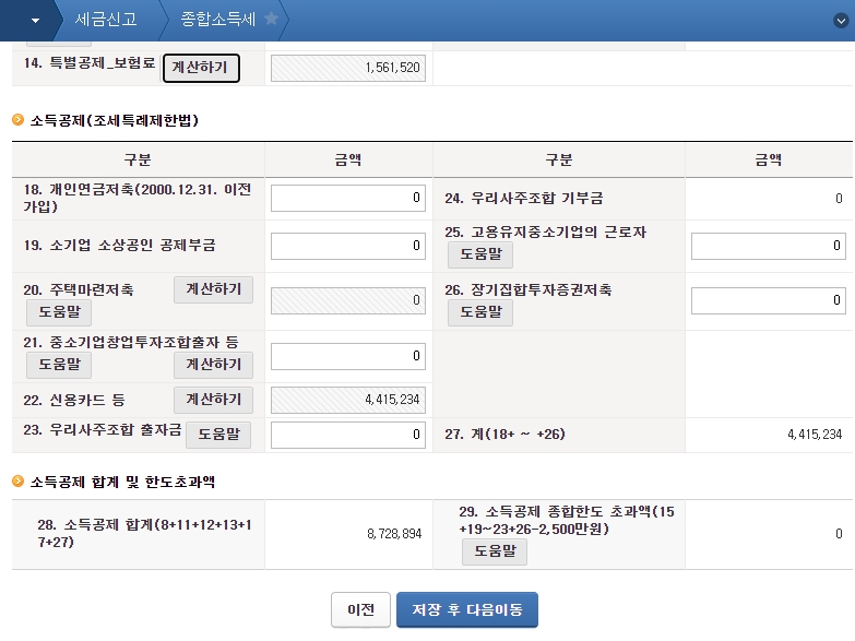 9. 소득공제명세서를 표시하는 페이지인데, 가장 중요한 페이지입니다. 이 공제금액이 얼마나 제대로 적용받느냐에 따라 세금이 많고 적음이 갈리기 때문이죠.
