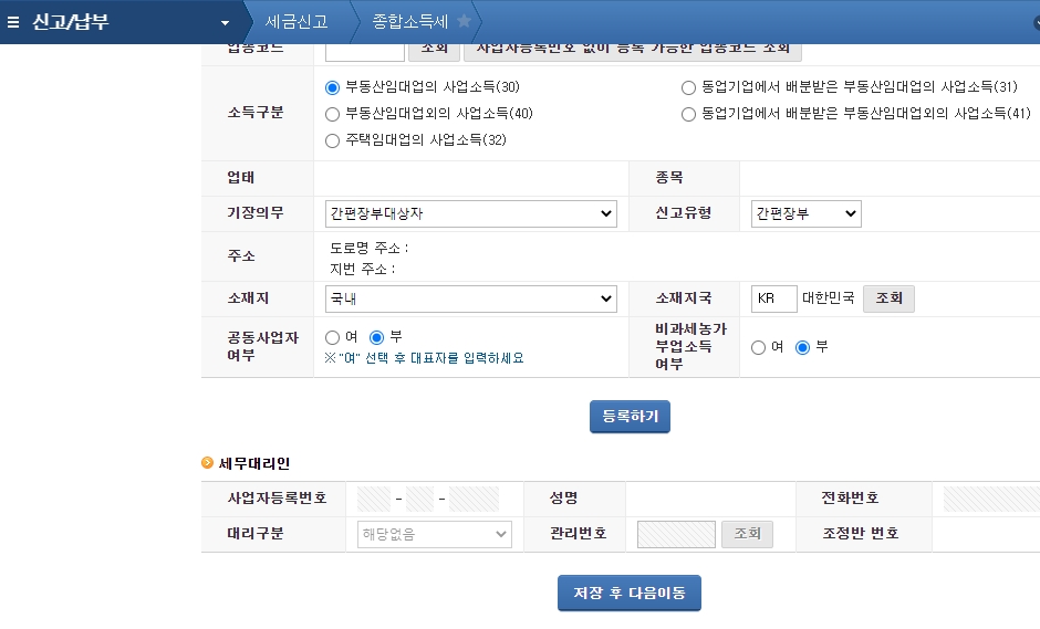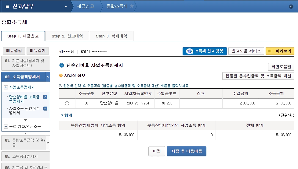 6. 위에서 보면 저 같은 경우 임대사업이 단순경비율에 해당되어 금액이 이상 없으면 앞에 체크한 후 저장 후 다음 이동으로 가겠습니다.