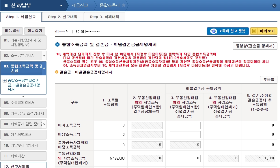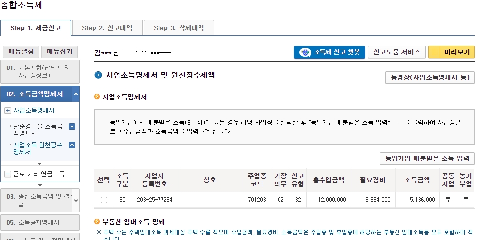 7. 윗부분은 단순경비율에 따라 필요경비가 자동으로 계산되어 소득금액이 산출된 모습입니다.