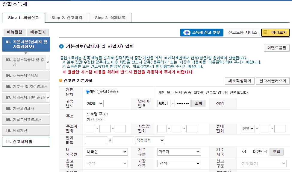 4. 왼쪽에 보시면 번호가 차례대로 있는데, 10번까지 기록하면 신고서 제출을 할 수가 있어요. 여기는 기본사항을 기록하는 페이지입니다. 기록하시다 보면 해당 없는 것들도 많으니 해당되는 사항들만 쭉 기록해 나가시면 됩니다. 중간중간에 뭐 좀 이상하게 했다 싶으면 로봇이 알려주기도 합니다.