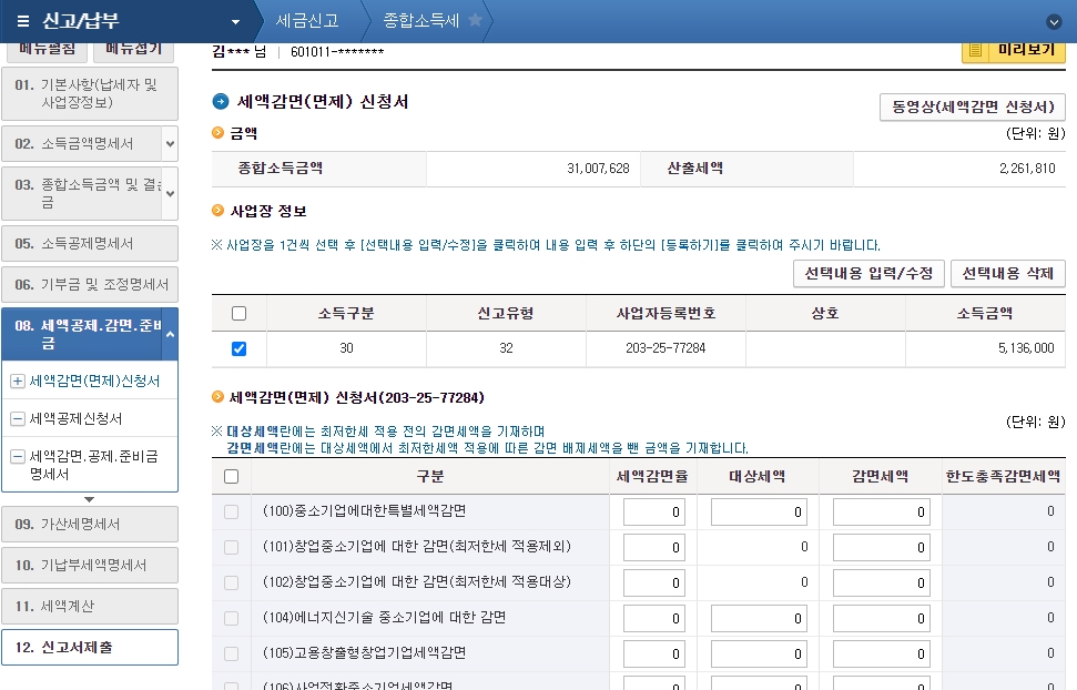 12. 세액감면 해당되는 사람에 대한 세액감면에 관한 사항입니다. 저는 감면에 해당되는 부분이 없고, 전자신고에 대한 감면 2만 원만 있네요. 이건 자동으로 뜹니다. 위에 보이다시피요. 그냥 확인만 하고 저장 후 다음 이동 누릅니다.