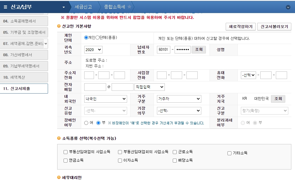 - 종합소득: 근로, 연금소득, 이자소득, 배당소득, 사업(부동산 임대) 소득, 기타 소득