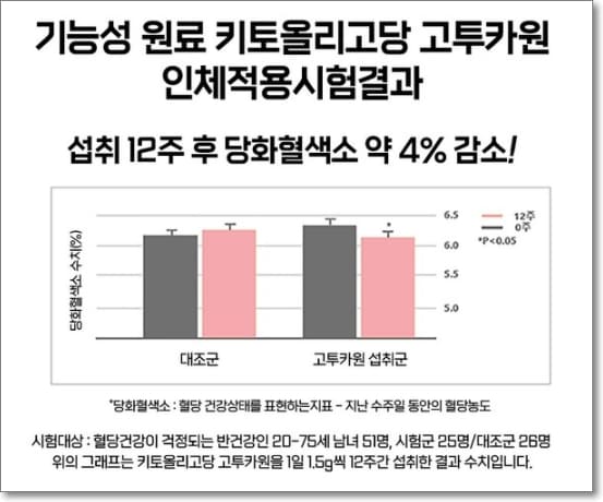 키토올리고당 고투카원을 매일 1.5g씩 12주 동안 섭취해 본 결과인데요. 12주 후에 당화 혈색소가 약 4% 감소했다는 결과 가 나왔어요. 반면에 섭취하지 않은 26명은 당화혈색소가 약 1% 정도 증가한 것을 보실 수 있습니다.