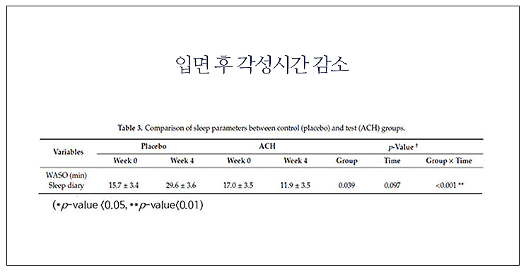 2) 입면 후 각성 시간 감소: 수면 중에도 가끔 깨어 있는 시간이 있는데, 이 시간이 감소함
