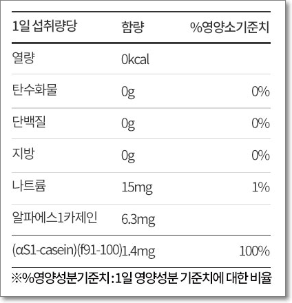 위 영양 기능 정보에서 보시면, 맨 아래에서 두 번째에 알파에스 1 카제인 6.3mg이라고 표기돼 있죠.