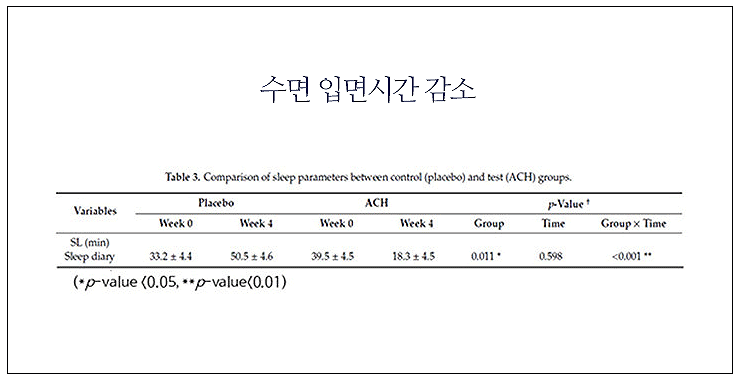 이 연구는 수면에 불편함을 호소하는 성인 48명을 대상으로 이대 목동병원에서 이루어졌는데요. 실험방법은 유단백 가수분해물(락티움) 300mg을 4주 동안 매일 섭취하게 한 결과라고 합니다.