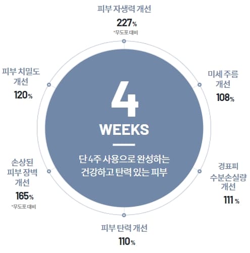 단 4주만 사용했는데도 피부 자생력 개선이 227%, 피부 치밀도 개선이 120%, 손상된 피부 장벽 개선이 165%, 피부 탄력 개선이 110%, 미세주름 개선이 108%, 경표피 수분 손실량 개선이 111%나 되었다고 해요.