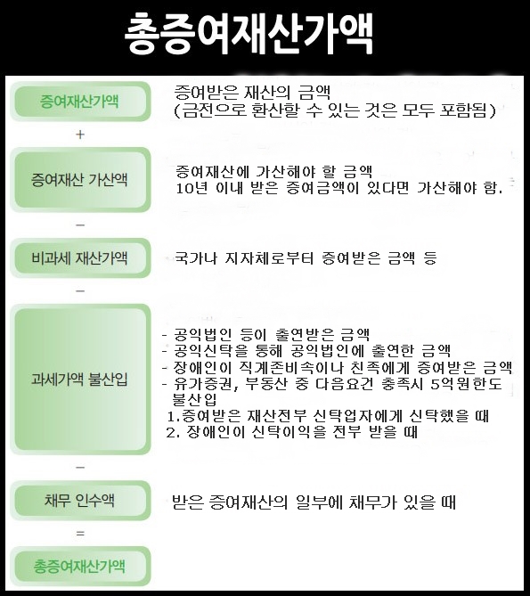 위의 계산방법은 기타사항이 없다고 보았을 때, 기본 증여재산공제만 할 때 해당되는 내용이고 기타 가감할 내용이 있으면 내용에 따라 반영시켜야 정확한 총 증여재산가액이 산출됩니다.