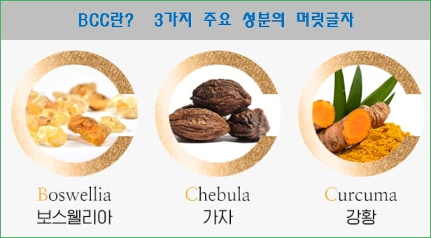 전 처음에 이 BCC가 뭘까? 했었는데요. 바로 Boswellia(보스웰리아), Chebula(가자), Curcumin(강황)의 영문자 앞글자를 따서 BCC라고 이름 붙인거였네요.