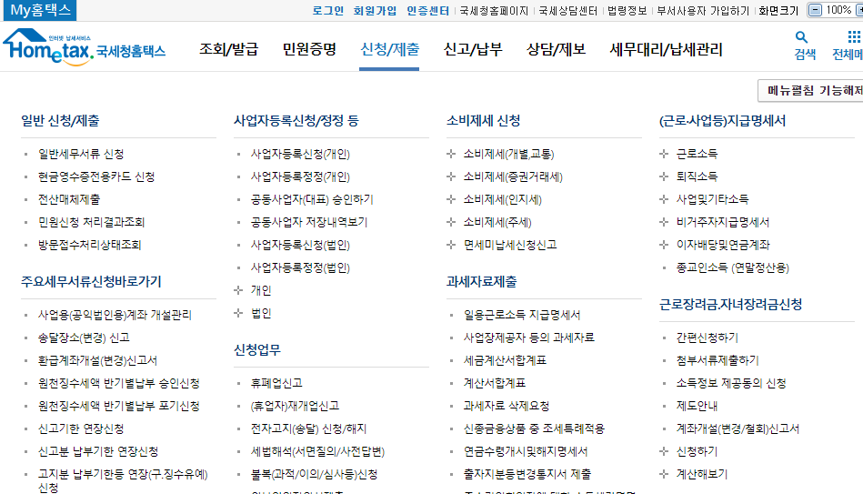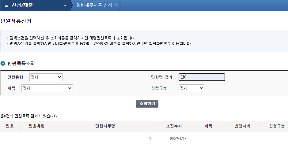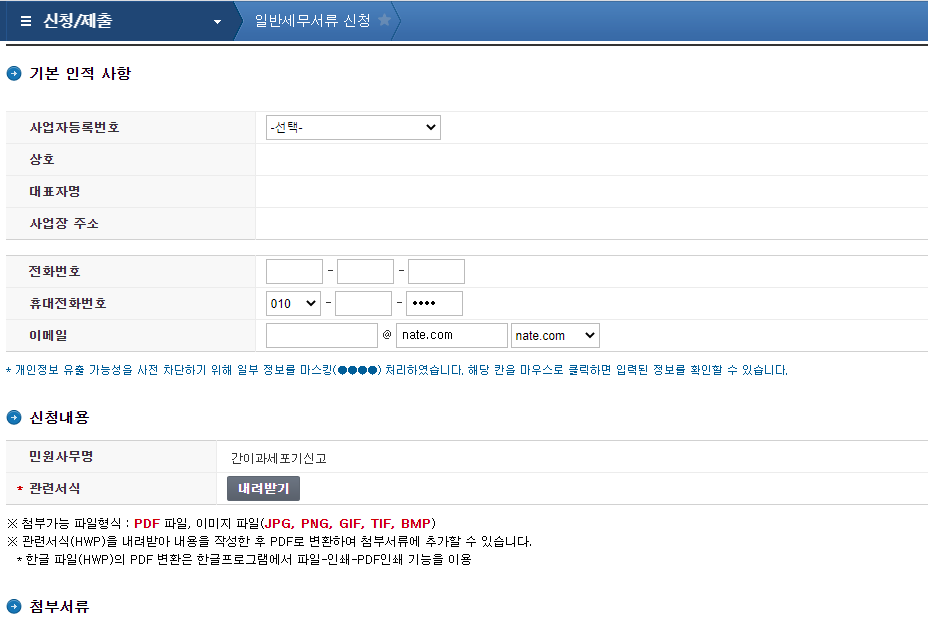 3. '신청/제출'> '일반신청/제출> '일반세무서류신청' 을 클릭하면 다음의 화면이 나옵니다.