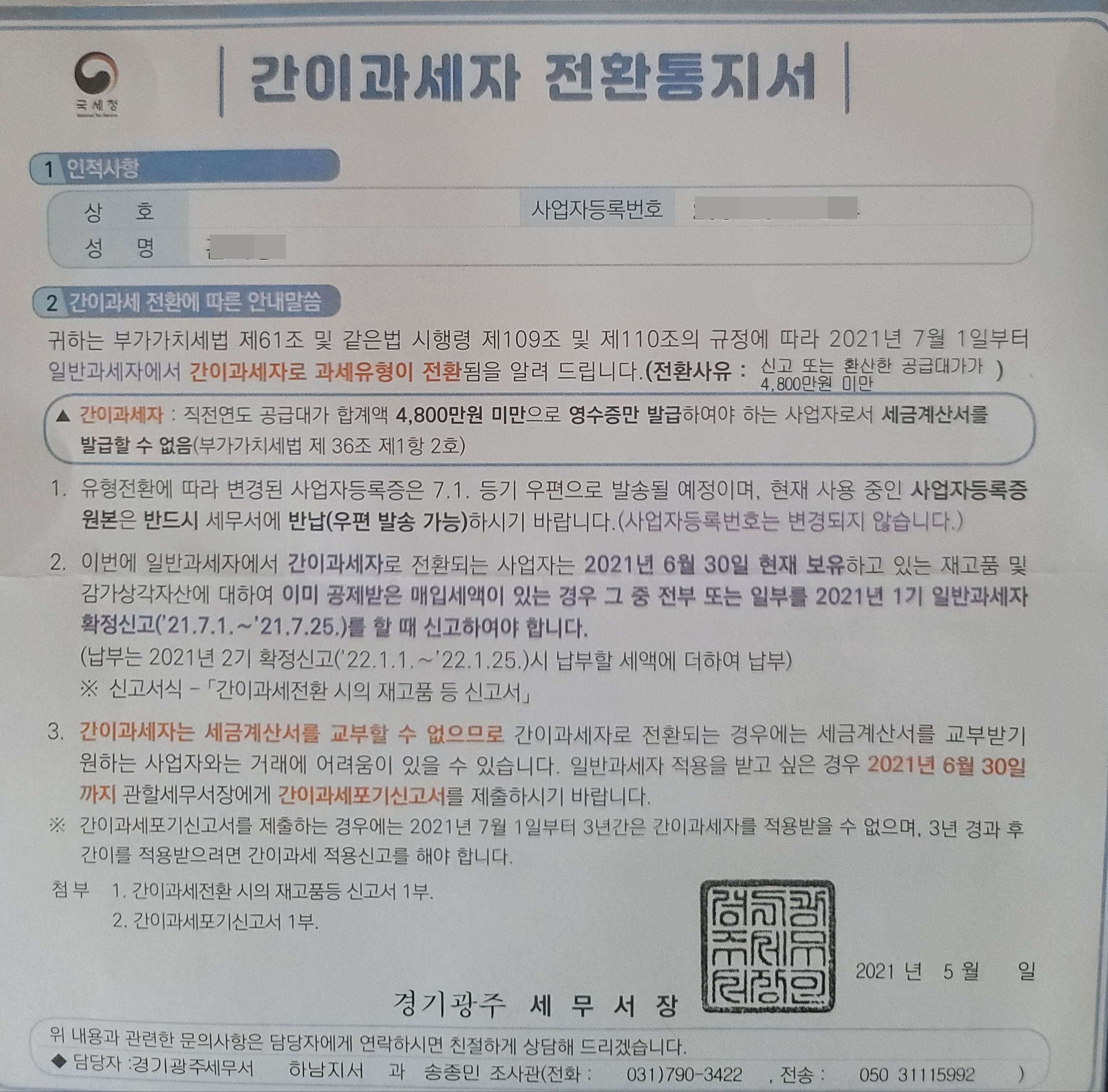 갑자기 날아든 간이과세자 전환 통지서