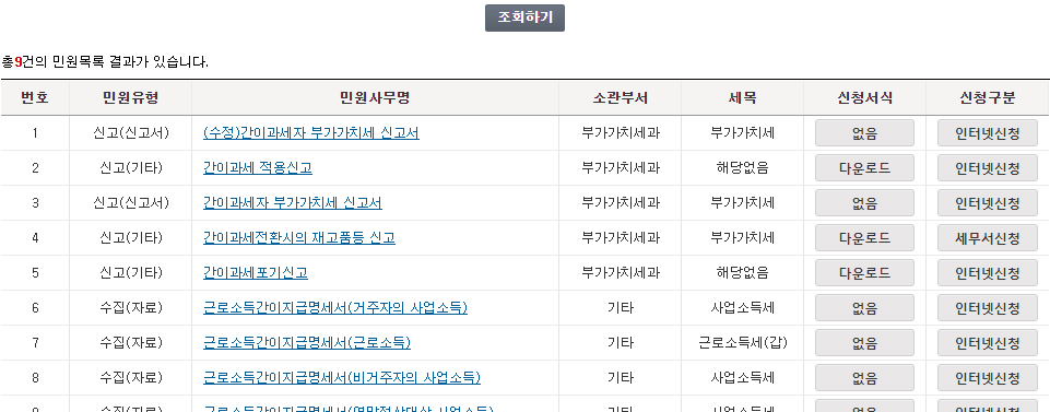 4. 민원명 찾기에서 '간이'라고 입력한 후 조회를 클릭하면 5번의 '간이과세 포기신고'가 나옵니다.