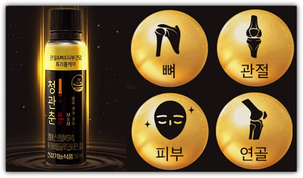 청관춘은 (주)프라임생활건강에서 만들고 한의사 김종국 원장이 배합한 뼈, 관절, 피부, 연골 4중 기능성을 가진 건강기능식품인데요.