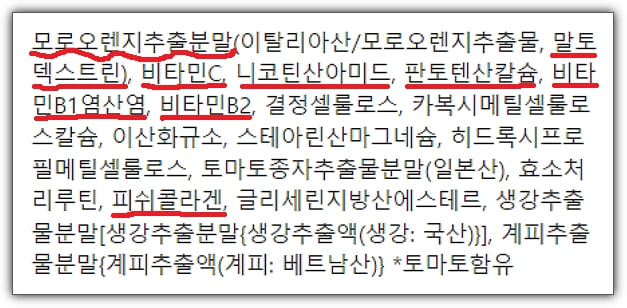 성분을 보면 일단 모로오렌지추출분말, 말토덱스트린, 비타민C, 니코틴산아미드(나이아신아마이드), 판토텐산칼슘, 비타민 B1, 비타민 B2, 피쉬콜라겐 정도가 주요원료라고 할수 있습니다.