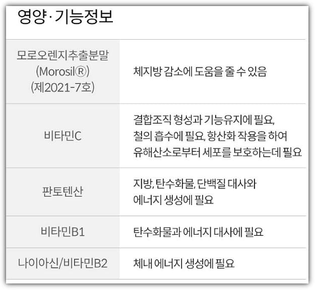 모로오렌지추출분말은 우리가 모로실이라고 하는건데요. 효능은 체중감소에 도움을 주는 것이고 식약처로부터 체지방감소 기능성으로 인정을 받았습니다.