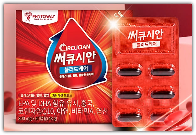 써큐시안 블러드케어는 파이토웨이란 회사에서 만든 혈관건강관리 건강기능식품으로 혈중 지질개선, 혈행개선, 혈중 콜레스테롤 개선, 항산화와 높은 혈압감소에 도움, 정상적인 면역기능, 어두운곳에서 시각적응, 세포와 혈액생성, 태아 신경관 성장 발달 등에 도움을 줄수 있다고 하는데요.