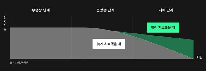치매를 근본적으로 치료하진 못하더라도 조기발견하고 치료했을 때와 늦게 치료했을 때 인지기능 유지기간의 차이는 정말 크다는 것을 위 그래프를 통해 알수 있으니, 조기발견의 중요성이 얼마나 큰지 느끼게 되는데요.