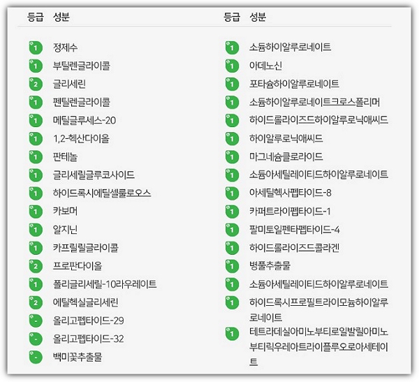 그외에도 다양한 성분들이 함유돼 있는데, 효능도 효능이지만 소중한 피부에 사용할 성분이라 전성분을 EWG그린 등급의 저자극 화장품으로 구성했다고 해요.