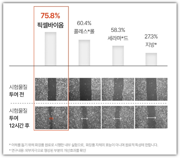 픽셀바이옴TM은 피부장벽성분보다 평균 56%더 빠른 효과를 확인했다고 하는데요. 지방이 27.3%, 세라마이드가 58.3%, 콜레스테롤이 60.4%인데 비해 픽셀바이옴TM은 무려 75.8%의 속도를 보인것으로 나타났답니다.(아래 그림 참조)