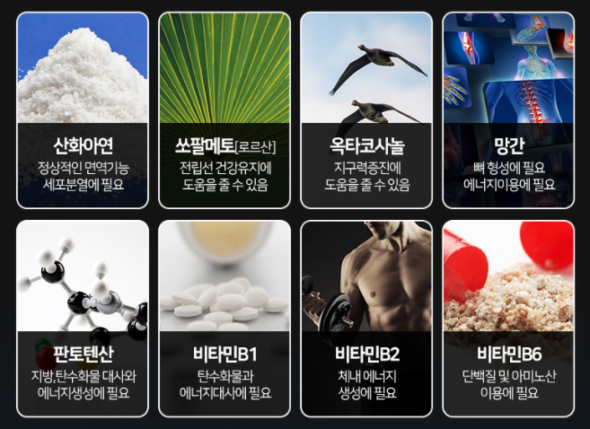 캐다다에서 만들어서 세계 50여 개국가에 시판되고 있는 비교적 검증된 남성 영양제로, 한국 식약처에서도 기능성을 인증받아 한국에서도 많이 판매되고 있죠.