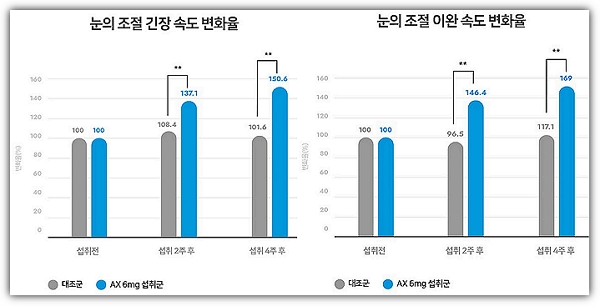 아스타잔틴이 눈의 피로에 좋다는 사실은 인체적용시험으로 증명되었는데요. 실제로 성인 36명을 대상으로 섭취군(18명)과 대조군(18명)으로 나눠 4주 동안 실험해 본 결과, 섭취군은 섭취 전에 비해 망막 모세혈관 혈류량이 늘어난 것으로 나타났고요. 또 성인 40명을 대상으로 섭취군과 대조군으로 나눠 시험해 본 결과, 눈조절력 개선, 조절긴장속도와 이완속도가 모두 개선된것으로 나타났습니다.(아래 그래프 참조)