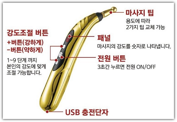 • 마사지펜 사용시 손잡이 부분에서 미세한 전기자극 느낌이 들수 있는데, 이는 불량이 아니며 미세전류 순환에 의한 자연스런 현상이라고 해요.이땐 손잡이 부분을 손으로 꽉 쥐면 손잡이의 전기 자극을 완화시킬수 있다고 하니 꼭 참고하세요.
