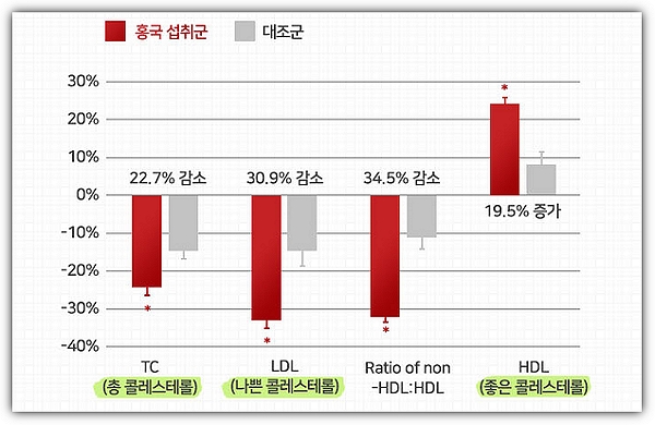 한편, 홍국의 혈중 콜레스테롤 수치 개선에 대한 실험도 있었는데요. 446명을 대상으로 하루 1.2g씩 8주동안 섭취해 본 결과, 총 콜레스테롤은 감소, LDL콜레스테롤 감소, HDL콜레스테롤 증가의 효과를 관찰했다고 합니다.(아래 그림 참조)