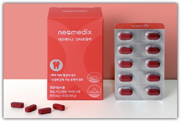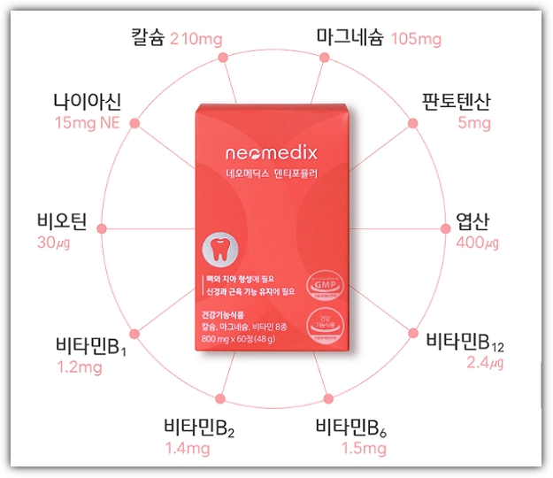 네오메딕스 덴티포뮬러는 치아건강을 위한 건강기능식품으로, 치아 건강에 가장 필요한 칼슘을 핵심원료로 하여 마그네슘을 이상적으로 배합하고 활력을 위한 비타민 8종과 자일리톨 등 부원료9종을 추가해 만든 영양제입니다.