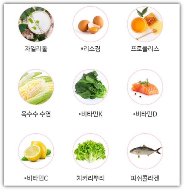 그 외에도 부원료로 자일리톨, 리소짐, 프로폴리스, 옥수수 수염, 비타민K, 비타민D, 비타민C, 치커리뿌리, 피쉬 콜라겐이 추가 되어 시너지 효과를 더했습니다.