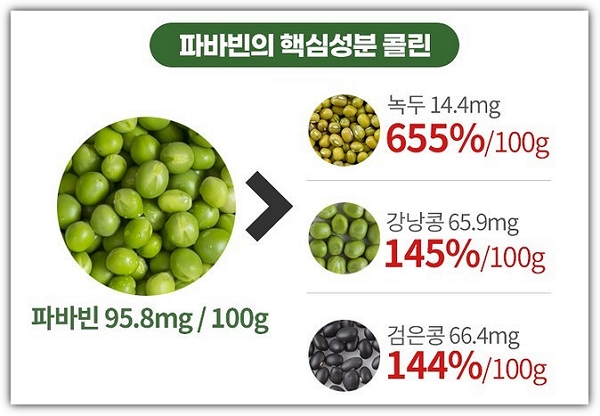 이 중에서도 비타민B복합체의 한가지로 에너지생성과 운동수행과 근육기능에도 도움을 주는 파바빈의 핵심성분 콜린도 아주 많이 들어 있는데요. 강남콩과 검은콩보다 약 1.5배 많고 녹두보다는 약 7배가까이 많은 것으로 알려져 있습니다.