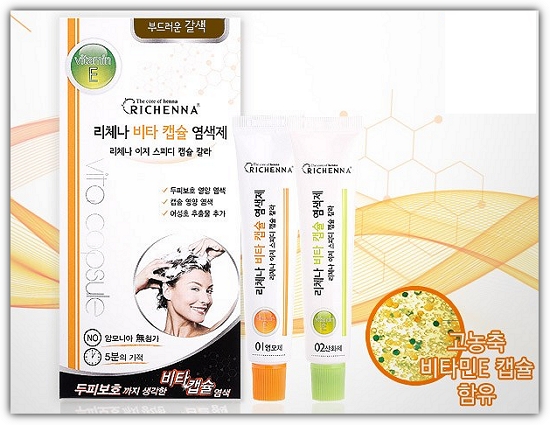 리체나 샴푸형 골드염색제는 누에고치추출물을 핵심성분으로 만들었고, 리체나 비타캡슐 샴푸형 염색제는 말 그대로 비타민을 캡슐화시켜 넣어 만든 염색제입니다.