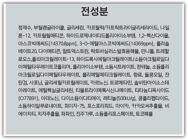 위 성분 중 눈여겨 보실 성분은 아스코빅애씨드와 레티놀인데요. 위에서부터 3번째 줄에 있는 아스코빅애씨드는 비타민C입니다. 그리고 아래에서 위로 3번째 줄에 보면 레티놀이 있습니다.