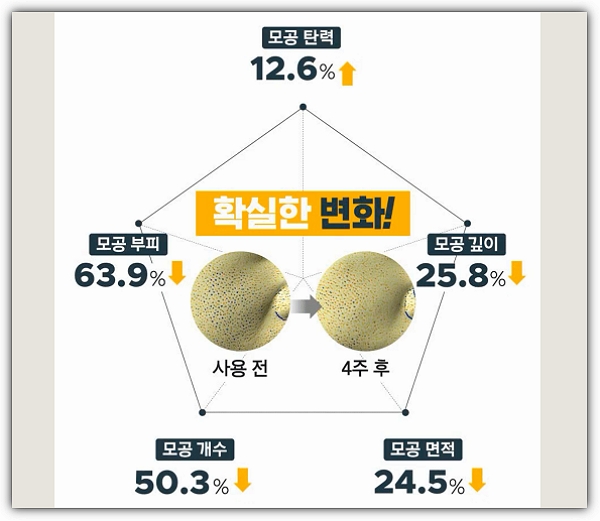 얼굴 부위별 인체적용시험결과로는 얼굴탄력증가효과로 얼굴면적이 넓은 뺨부위 탄력을 측정해본 결과, 4주만에 탄력이 13.5%증가하는 효과를 얻었는데, 시험에 참가한 대상자의 90%가 '피부의 탄력이 개선된 느낌이다'라고 응답했다고 합니다. 모공은 4주후 탄력 증가와 함께 모공 깊이, 면적, 개수, 부피가 감소되고 확실한 개선효과를 확인할수 있었다고 합니다.(아래 그림 참조)