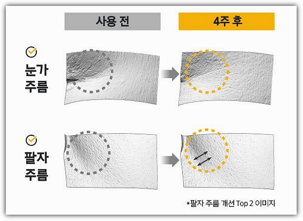 한편 눈가와 팔자주름 감소 효과도 관찰되었는데요. 제품 사용 4주후에 눈가와 팔자 주름이 눈에 띠게 감소되었음을 확인했다고 하는데요. 아래의 사진으로 확인해 보시기 바랍니다.