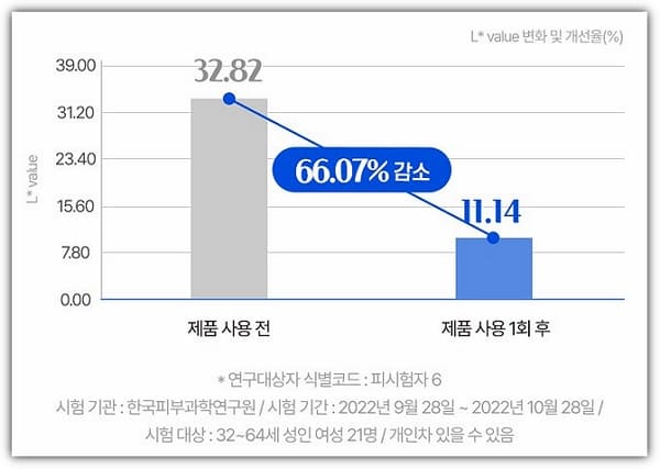 피부 광채 개선 효과도 있었는데, 1회 사용후 피부 광채는 24.27% 더 개선되었다고 합니다.