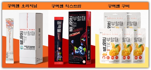 이 제품에는 강도 또는 형태에 따라 공먹젤, 공먹젤 익스트림, 공먹젤 구미 이렇게 3가지가 있는데요. 공먹젤은 오리지널, 익스트림은 오리지널보다 강한것, 구미는 카페인섭취에 민감하고 맛에 더 흥미를 느끼는 초등학생도 먹을수 있도록 구미형태로 만들었는데, 효과가 가장 강한게 익스트림, 그다음이 오리지널, 마지막으로 구미 순서랍니다.