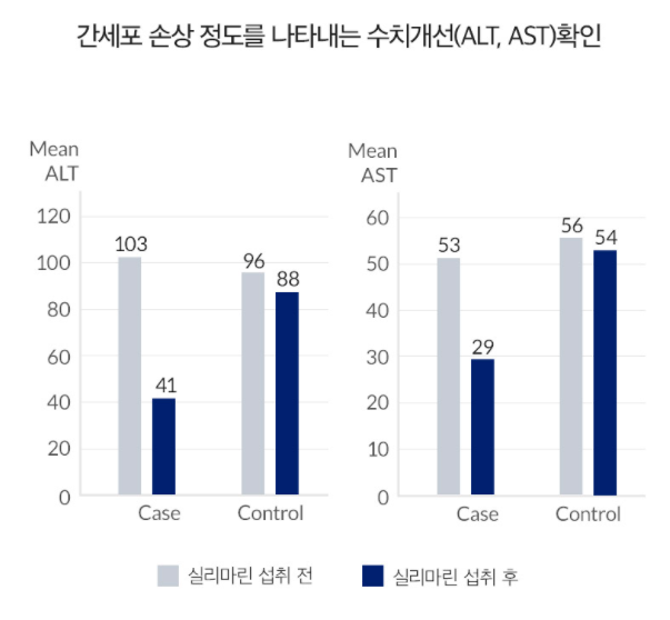 밀크씨슬 인체적용 시험 결과, 다음과 같이 간세포 손상이 줄어든 결과를 얻었다고 합니다.