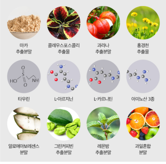 1) 마카 추출분말: 페루의 인삼으로 불리는 귀한 약재로, 생식기능 개선에 효능이 있어 남성 활력제에 많이 들어가기도 하죠.