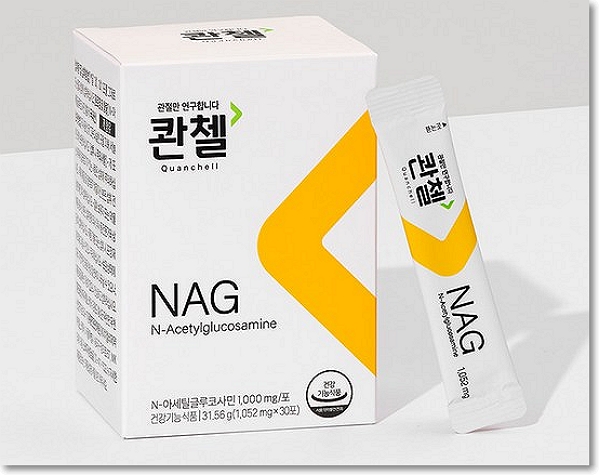 콴첼NAG는 NAG(N아세틸글루코사민)를 주원료로 만든 관절건강기능식품으로 관절엔 콴첼NAG라고도 부름.