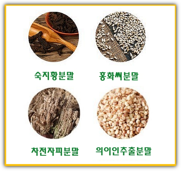 키즈홀쭉에는 주요성분 4가지 즉, 숙지항추출분말, 홍화씨추출분말, 차전자피분말, 의이인추출분말이 들어 있는데요.