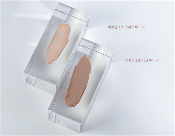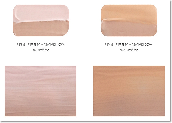파운데이션과 함께 사용할때는 밝은톤 피부에 추천하는 비체밤 비비크림1호 + 파운데이션100호 콤비네이션과 베이지톤 피부에 추천하는 비체밤 비비크림1호 + 파운데이션 200호 2가지 종류로 사용할수 있어요.