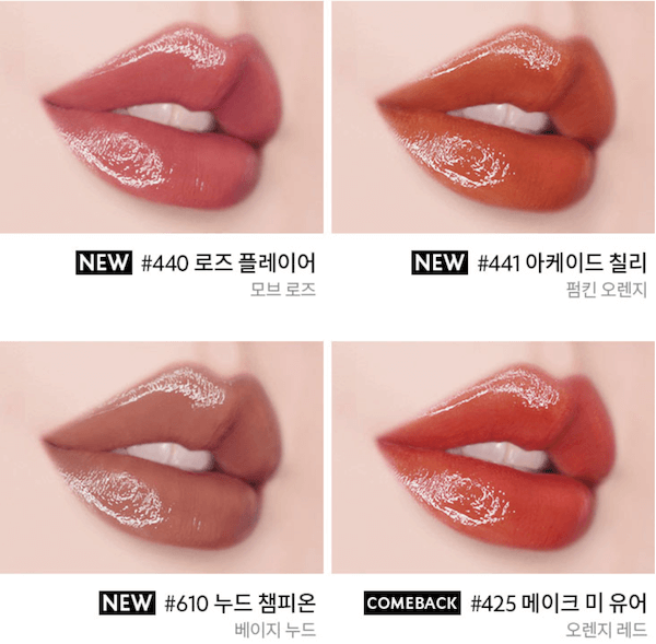 - 컬러가 너무 예뻐 금방 품절되면 어쩌나 싶었는데, 아직 남아 있어 너무 다행임. 440로즈플레이어와 425메이크미유어 구매했는데 둘다 컬러 미쳤음. 발림성 진짜 촉촉하고 미러글로스 어쩌고 하더니 진짜 번쩍 번쩍 함.