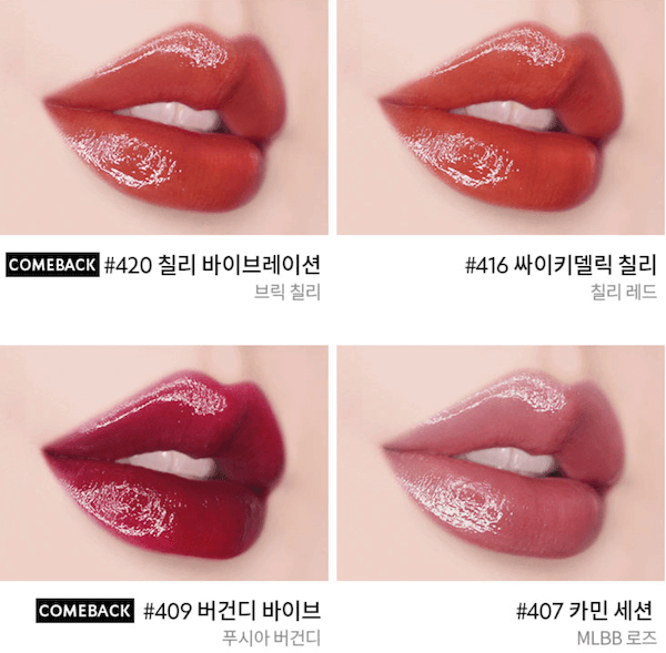409 버건디바이브, 420 칠리바이브레이션, 425 메이크미유어는 다시 컴백한 ICONIC 컬러 3종이라고 합니다.