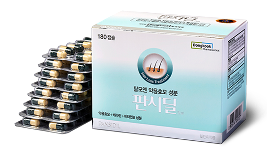 더 이상 탈모가 진행되지 않도록 하고 모발을 굵고 튼튼하게 해 주는 역할을 하는 것이 바로 동국제약에서 만든 '판시딜'이랍니다.